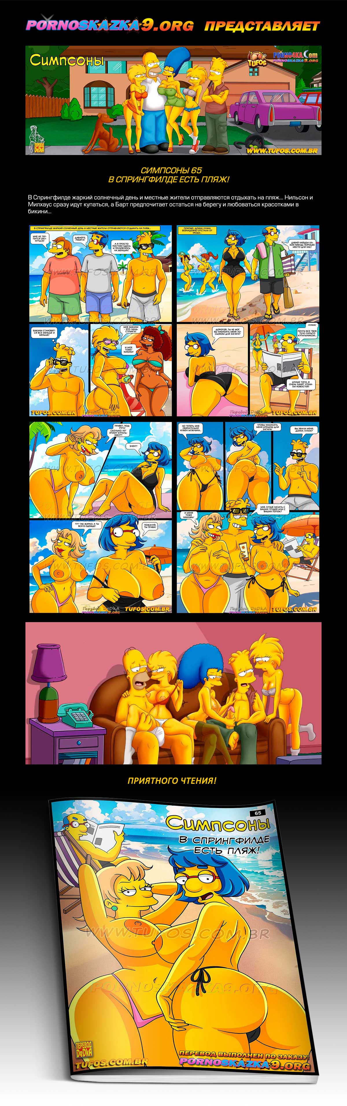 Порно комикс «Симпсоны. Часть 65. В Спрингфилде есть пляж!» В Спрингфилде жаркий солнечный день и местные жители отправляются отдыхать на пляж… Нильсон и Милхаус сразу идут купаться, а Барт предпочитает остаться на берегу и любоваться красотками в бикини…